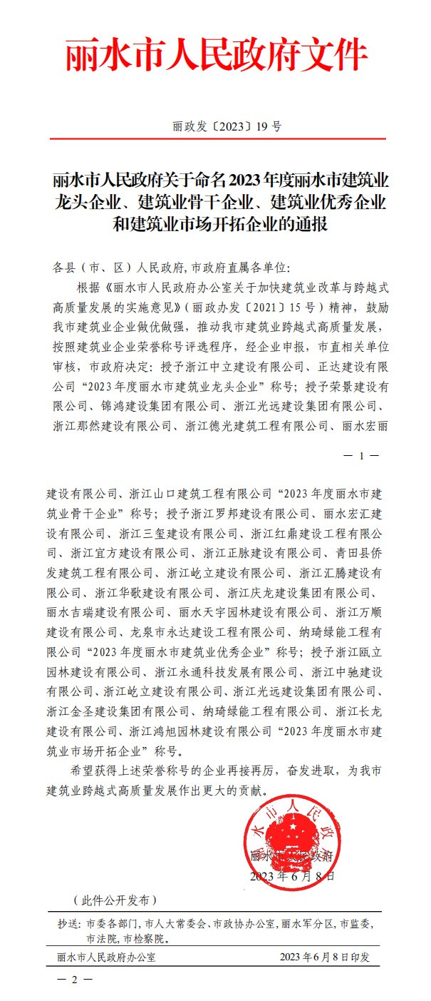 近日,麗水市人民政府通報了2023年度建筑業企業榮譽稱號評選結果,共有31家企業榮獲了麗水市建筑業企業榮譽稱號。